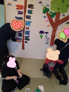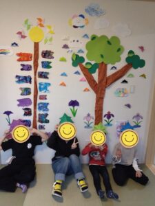今日は、鯉のぼりや兜の折り紙・雲などをいっぱい制作し5月節句の壁面制作をしました。